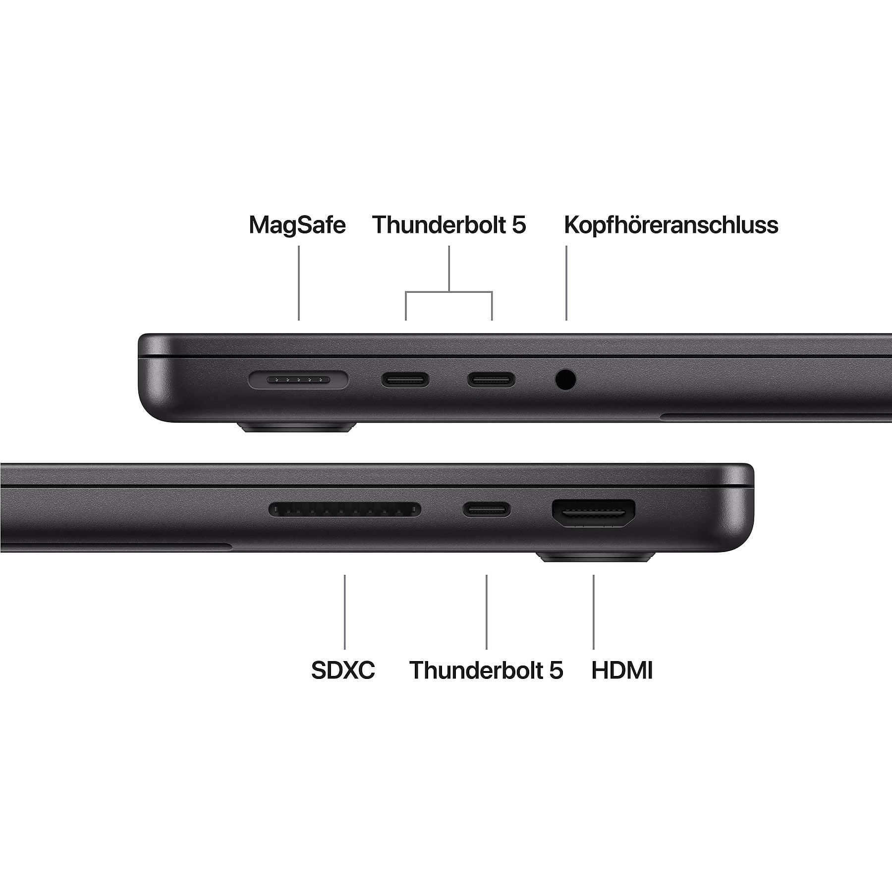 3x Thunderbolt 5 (USB-C) Anschlüsse mit Unterstützung für: Aufladen, DisplayPort, Thunderbolt 5 (bis zu 120 Gbit/s), HDMI Anschluss, SDXC Kartensteckplatz, 1x 3.5 mm Klinke, MagSafe 3 Anschluss |