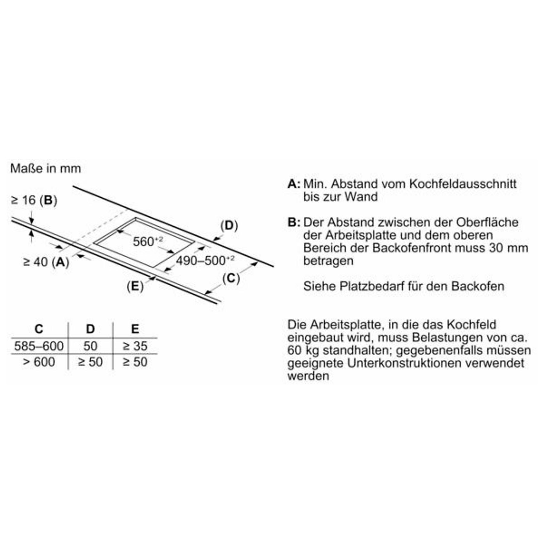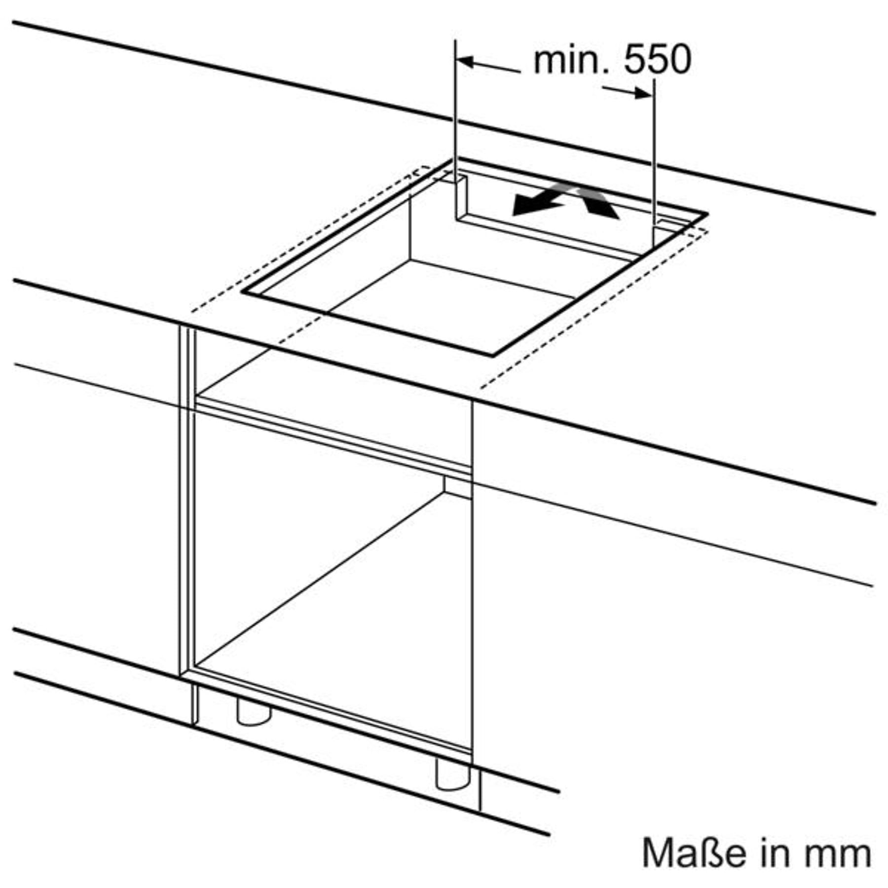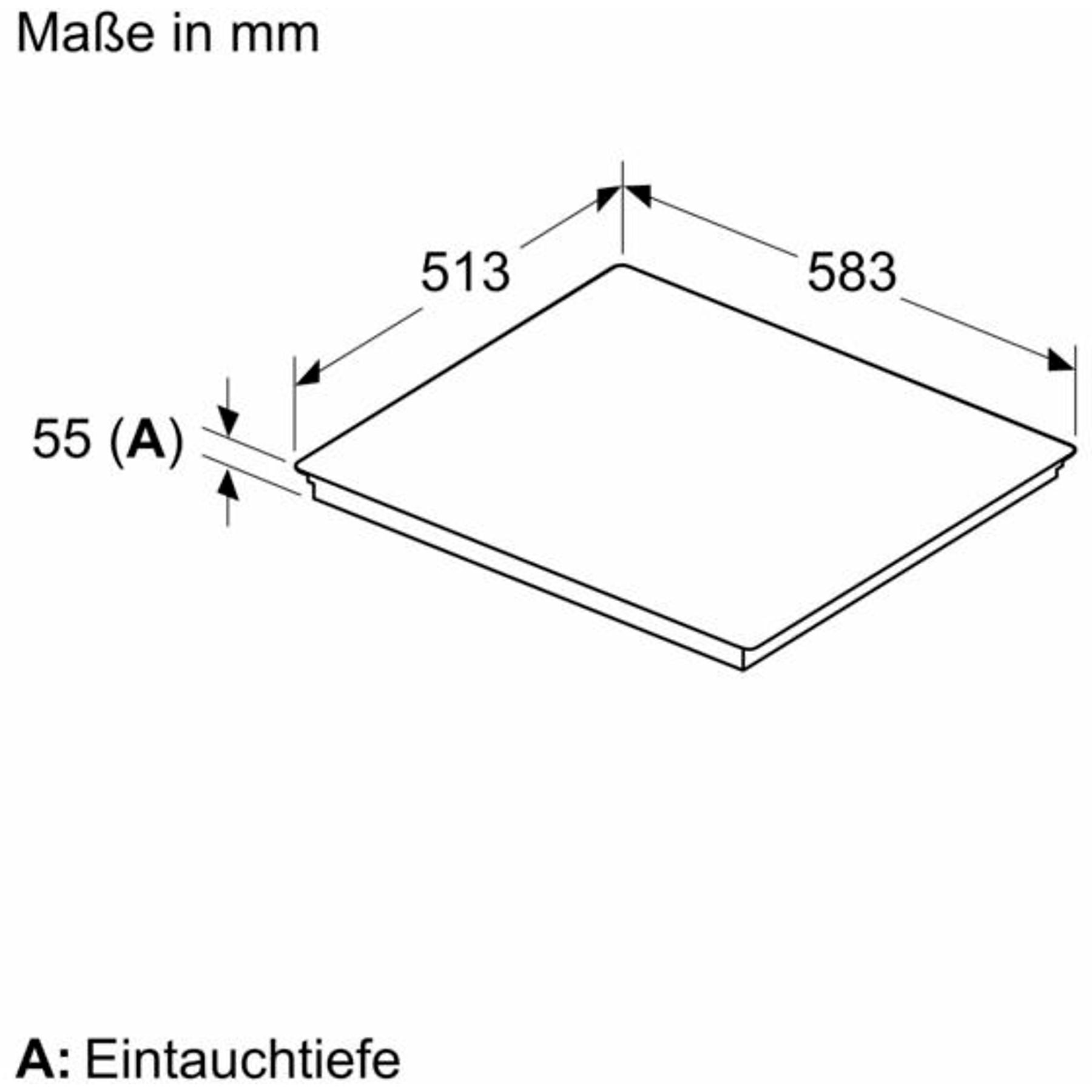 • Kochfeld: Breite 583 mm, Tiefe 513 mm, Höhe 55 mm