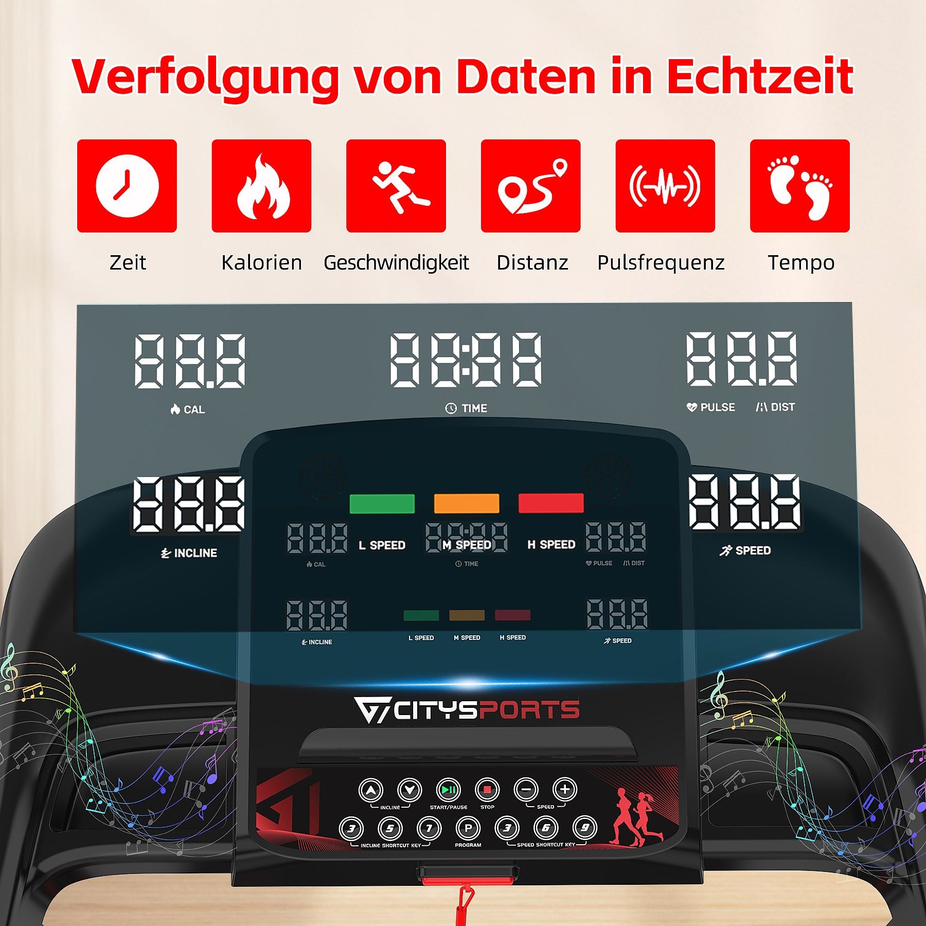 Dieses intelligente Laufband ist mit einer multifunktionalen Konsole ausgestattet, über die Sie Start/Stopp, Geschwindigkeit und die integrierte Bluetooth-Lautstärke steuern können. Der LED-Bildschirm zeigt Trainingsdaten in Echtzeit an, darunter Zeit, Entfernung, Kalorien, Geschwindigkeit und Herzfrequenz.