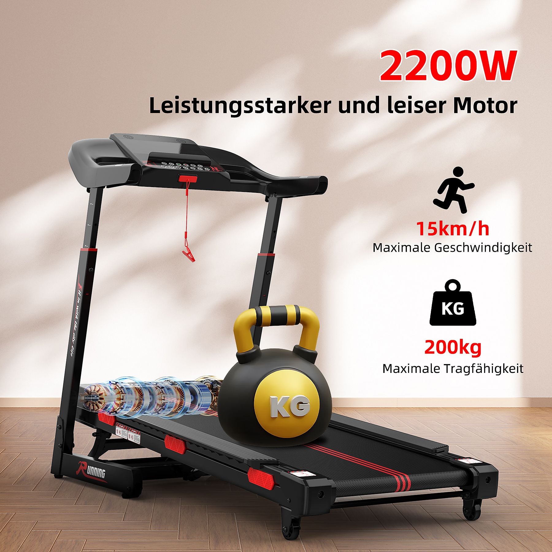 Das Laufband ist mit einem leistungsstarken 2200W Motor ausgestattet, der effizient und langlebig ist. Mit einer maximalen Geschwindigkeit von bis zu 15km/h unterstützt es effektiv das Ganzkörpertraining zur Fettverbrennung. Mit einer Gewichtskapazität von 200 kg kann es sicher Aerobic-Training für Benutzer aller Größen unterstützen. Die Lauffläche beträgt 120 x 43 cm.