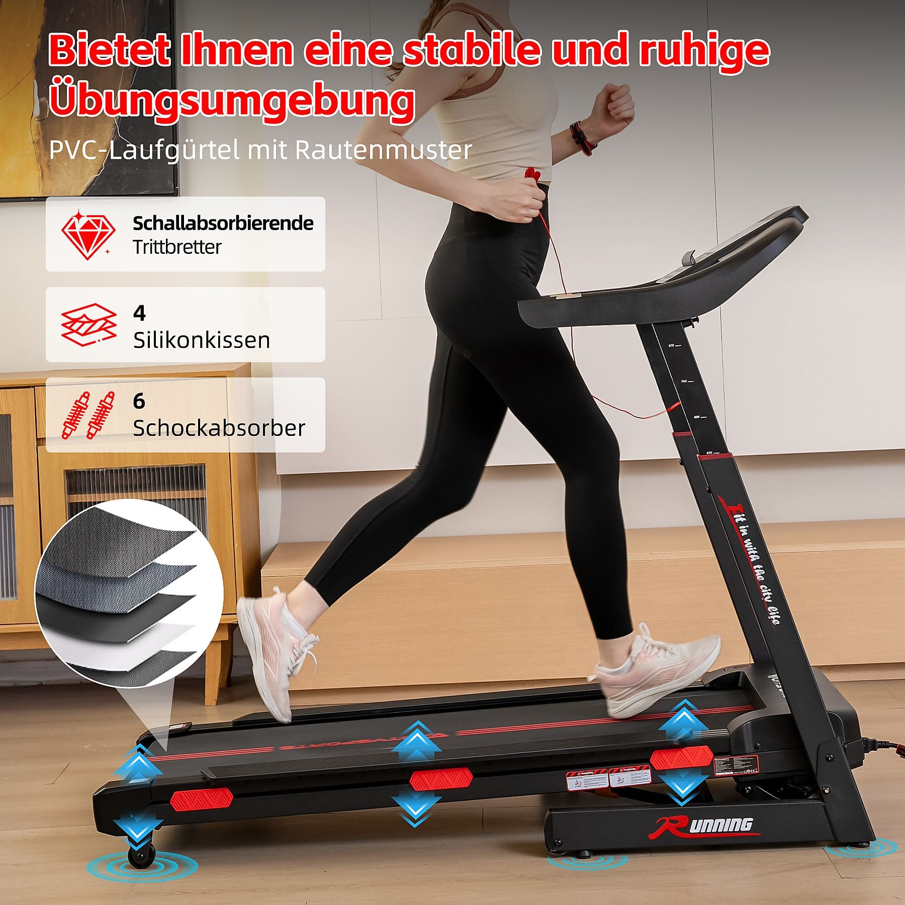 Um Ihre Gelenke während des Trainings zu schonen, ist dieses faltbare Laufband mit 8 eingebauten Stoßdämpfern auf beiden Seiten des Laufbretts ausgestattet, die die Vibrationen minimieren. Ebenso wie das neu entwickelte Anti-Rutsch-Laufband, das durch das PVC-Laufband mit Rautenmuster die Reibung und den Verlust des Laufbandes reduziert. Dieser Aufbau verbessert nicht nur die Laufsicherheit, sondern reduziert auch die Geräuschentwicklung und erhöht den Komfort.