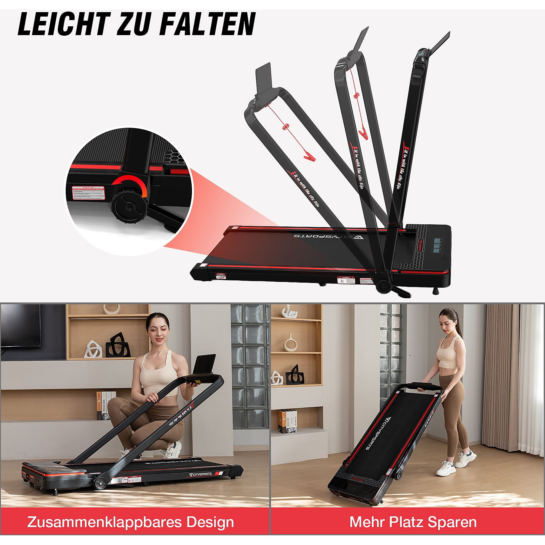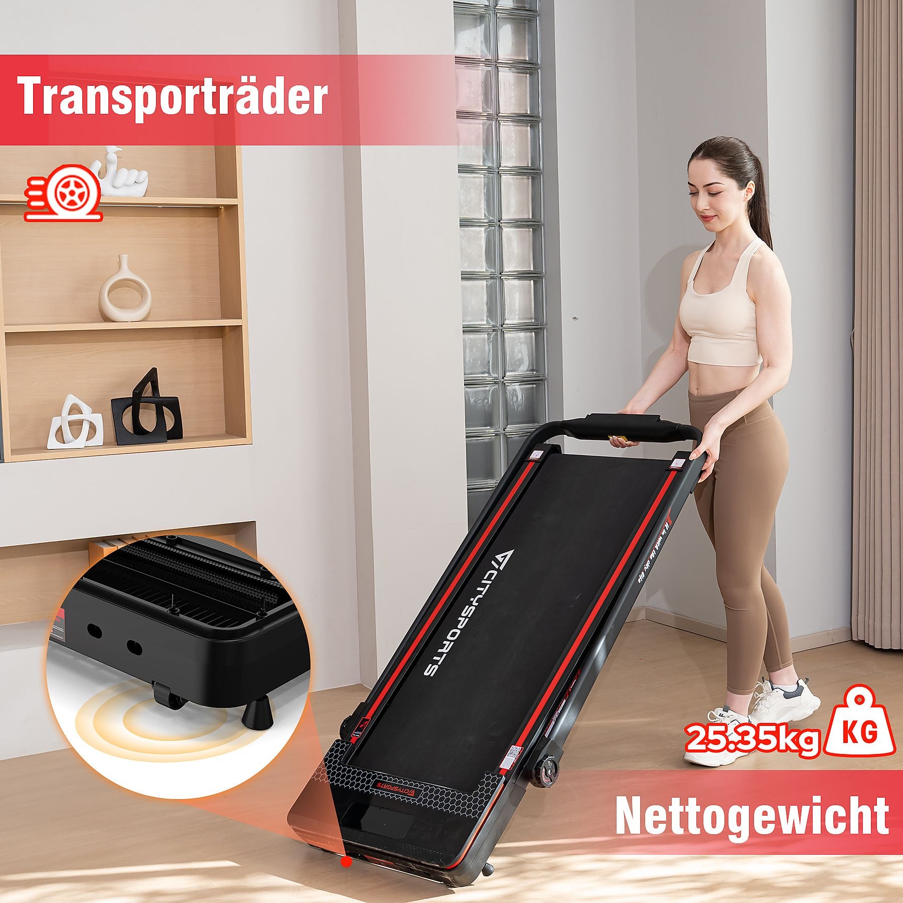 Keine Montage erforderlich, das Laufband kann direkt nach dem Auspacken benutzt werden. Es verfügt über ein Ein-Klick-Faltdesign, mit gefalteten Abmessungen von 1332*596*111mm und einem Nettogewicht von 25,35 kg. Ausgestattet mit Transportrollen kann er bei Bedarf leicht bewegt werden. Er kann flach unter einem Sofa oder Bett oder vertikal an einer Wand aufbewahrt werden, was Platz spart.