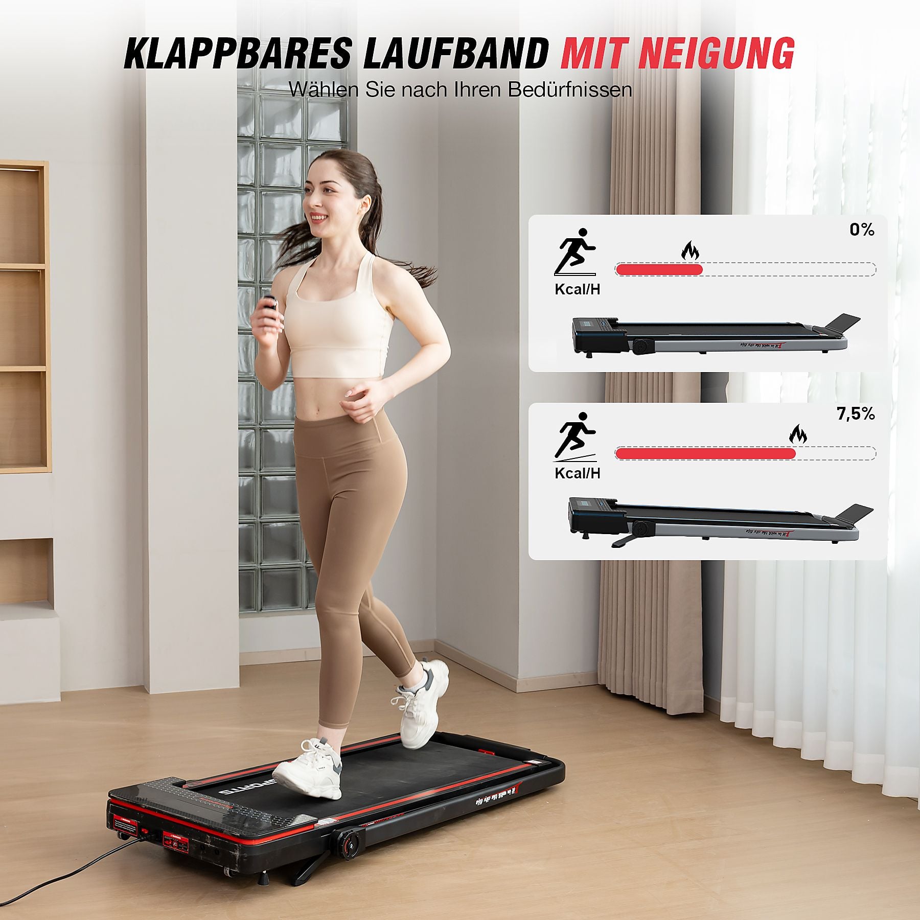 Dieses faltbare Laufband verfügt über zwei Modi: den Hochgeschwindigkeitsmodus mit angehobenem Lenker für Geschwindigkeiten zwischen 1-12 km/h und den Niedriggeschwindigkeitsmodus mit eingeklapptem Lenker für Geschwindigkeiten zwischen 1-6 km/h. Es verfügt über eine Gerätehalterung und integrierte Bluetooth-Lautsprecher, die Ihr Training unterhaltsam machen. Zusammengeklappt dient es auch als Untertisch-Laufband, so dass Sie während der Arbeit laufen können.