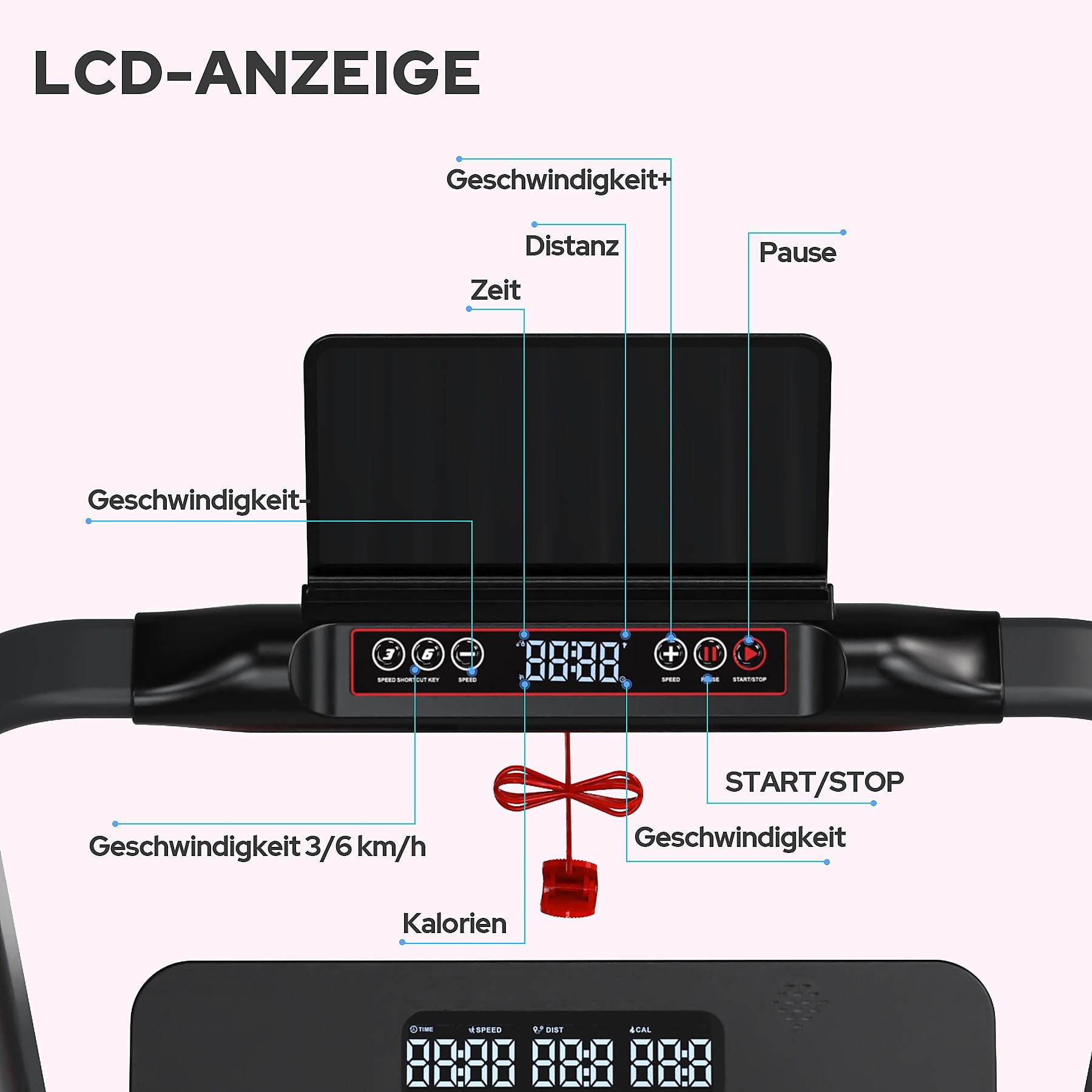 Die Lauffläche beträgt 1020*420mm, ein mehrschichtiges Anti-Rutsch-Design und eine Silikon-Säulenstütze. Es hat eine Gewichtskapazität von 110kg. Diese Eigenschaften absorbieren effektiv den Aufprall und bieten Dämpfung für Knie, Muskeln und Gelenke, was einen hervorragenden Schutz für Ihre Knie während des Trainings gewährleistet. Außerdem ist unser Laufband mit einem Sicherheitsschloss ausgestattet. Bitte befestigen Sie das Sicherheitsschloss am Laufband, während Sie es benutzen.