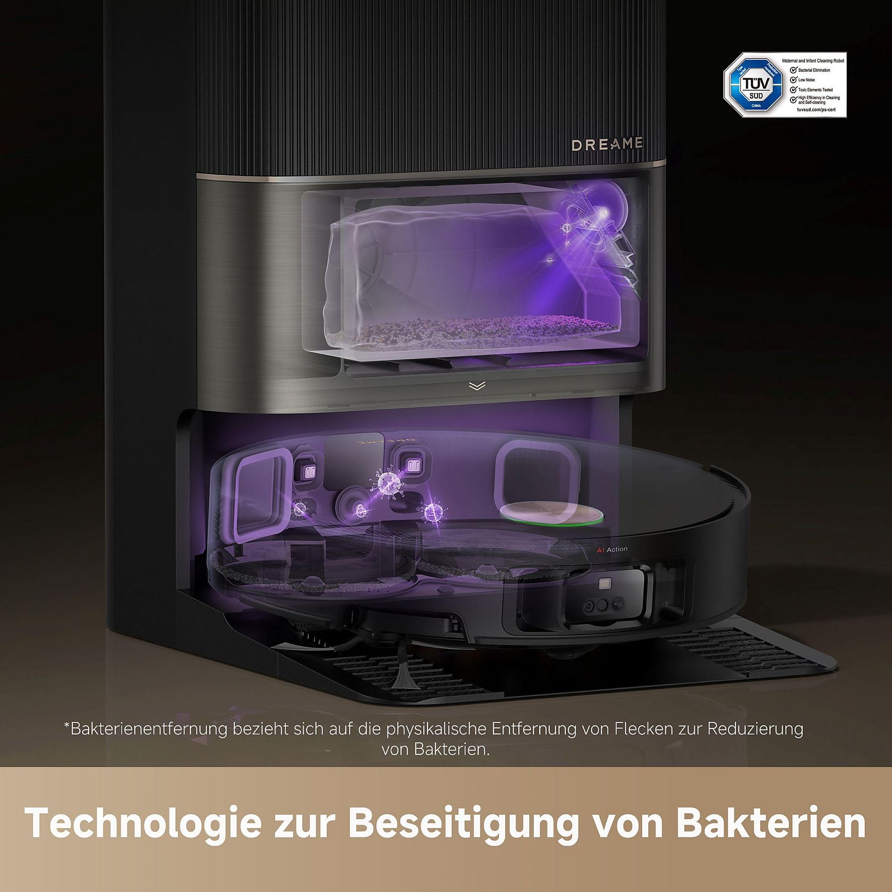 Vollautomatische Basisstation, 20.000Pa Saugkraft, motorisierter Roboterarm ermöglicht das Überqueren von Stufen und Schwellen, VersaLift-Navigation ermöglicht das Einfahren des Laserturms für eine gründliche Reinigung unter Möbeln, HyperStream™ DuoBrush verhindert das Verheddern von Haaren |