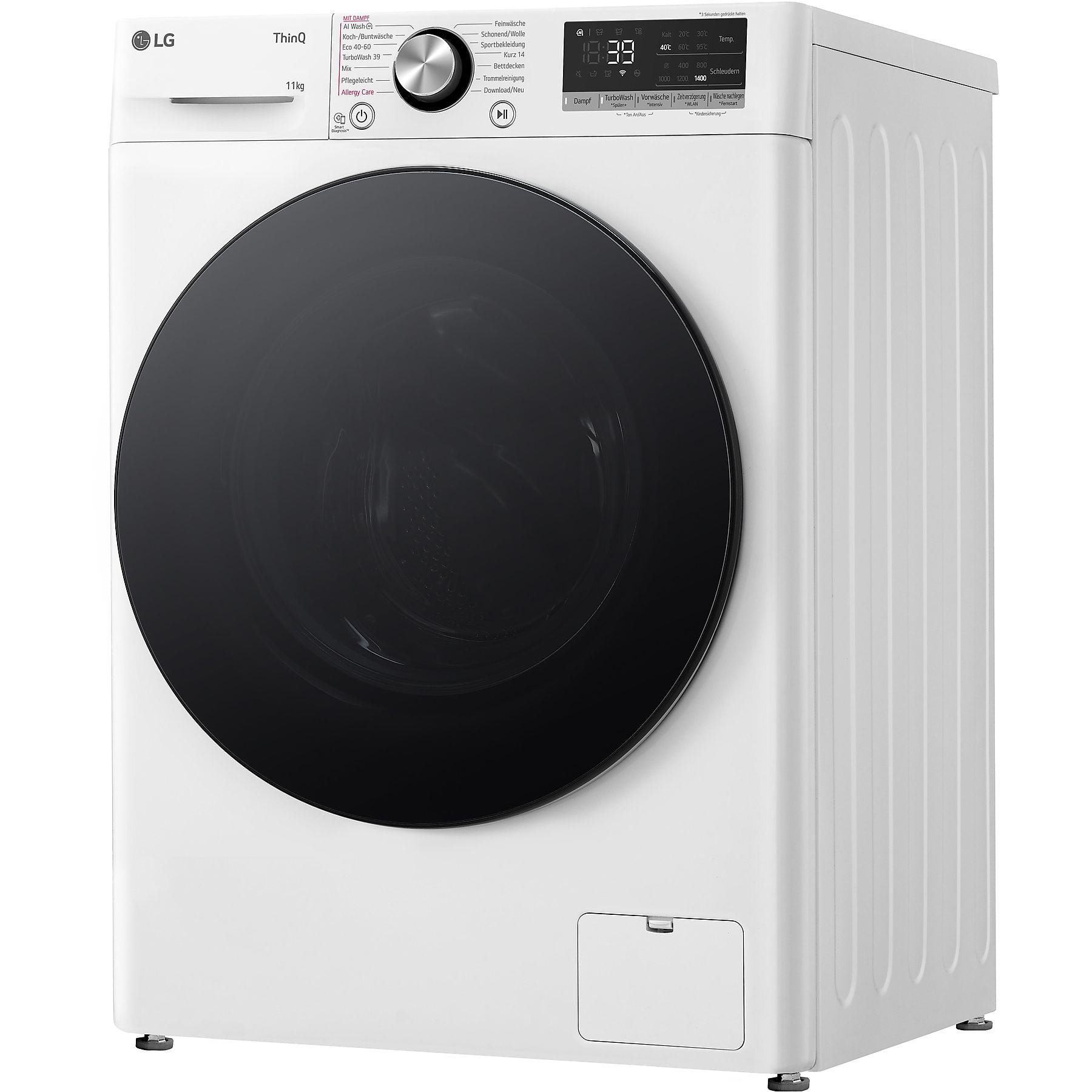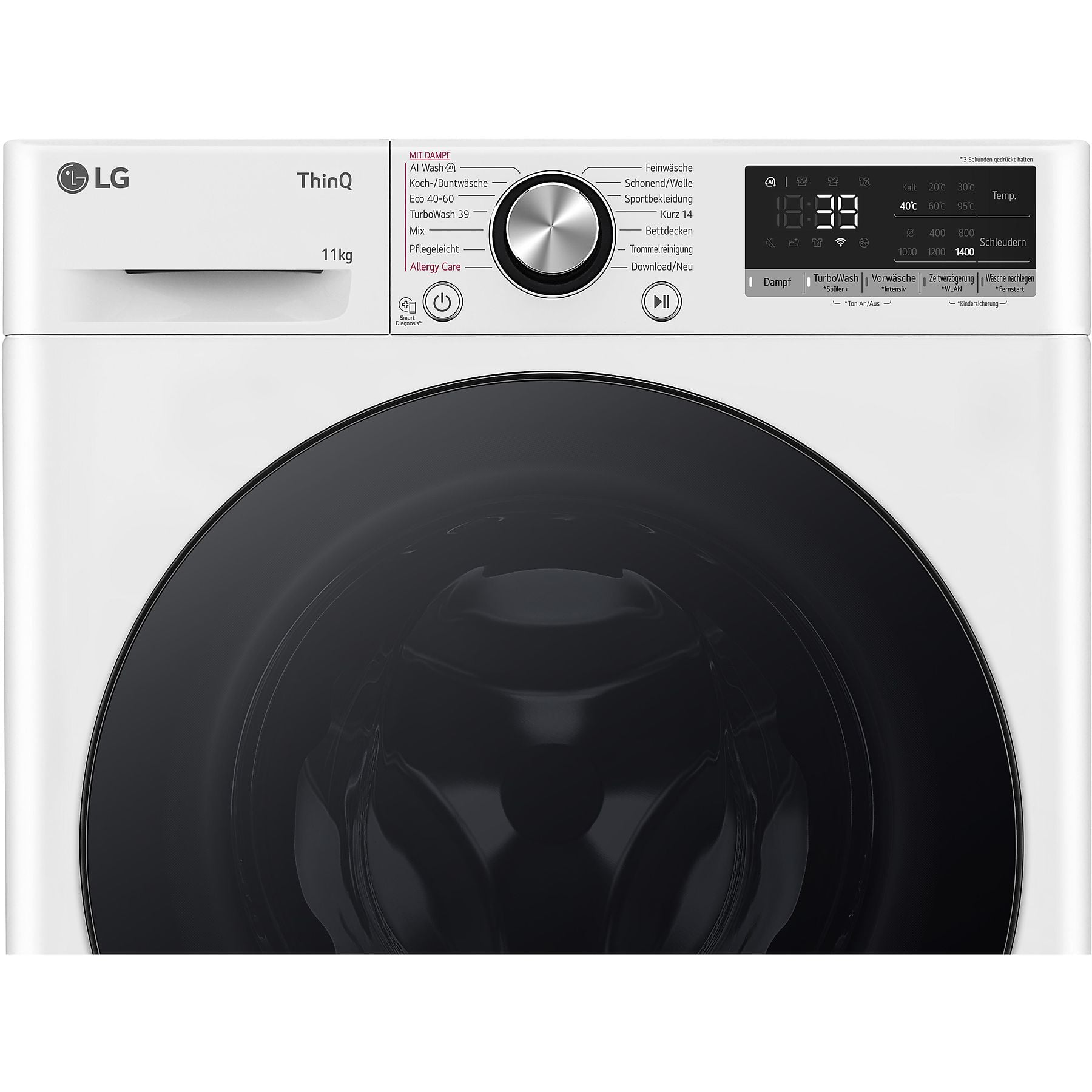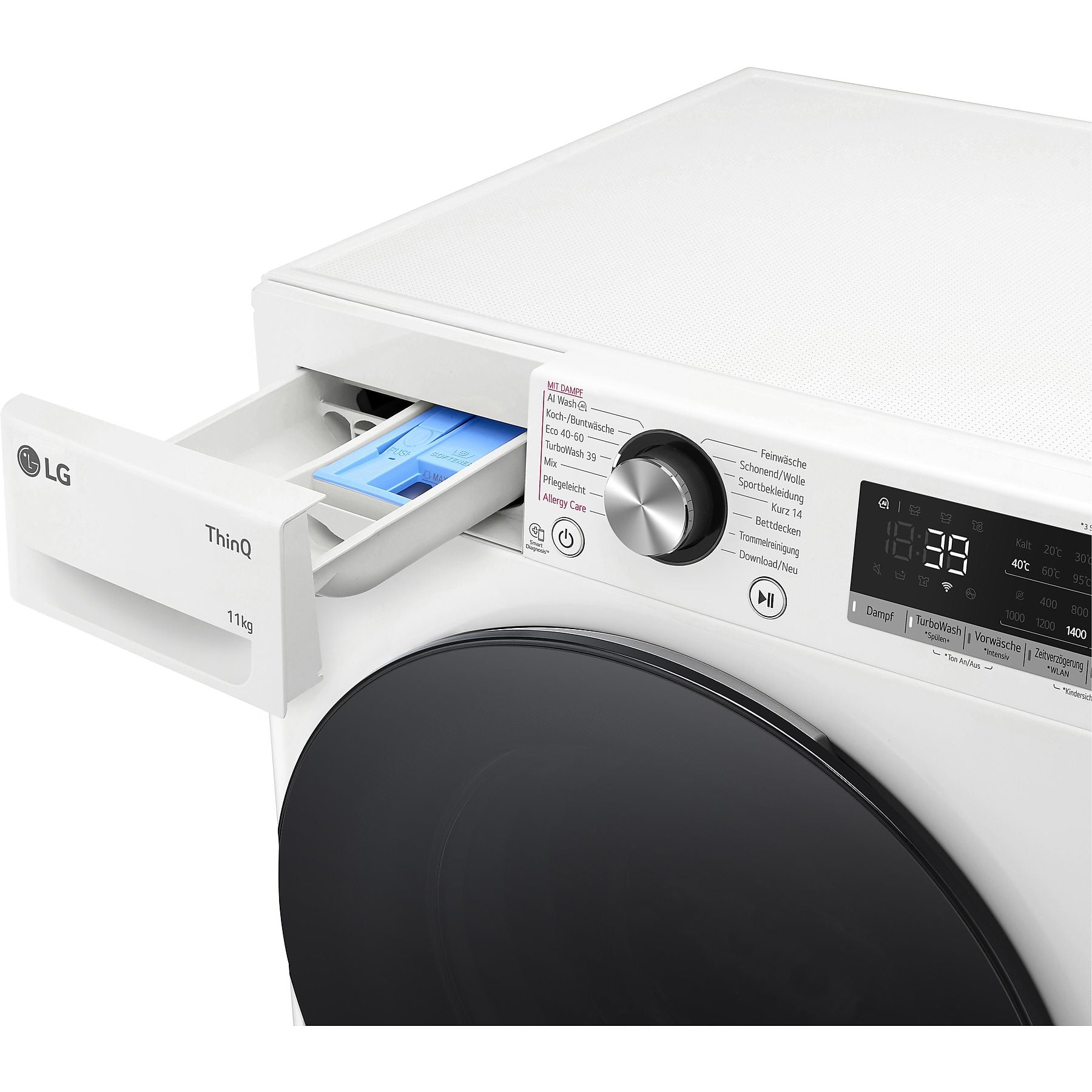 AI Wash, Koch-/Buntwäsche, Eco 40-60, TurboWash 39, Mix, Pflegeleicht, Allergy Care, Feinwäsche, Schonend/Wolle, Sportbekleidung, Kurz 14, Bettdecken, Trommelreinigung, Download/Neu. |