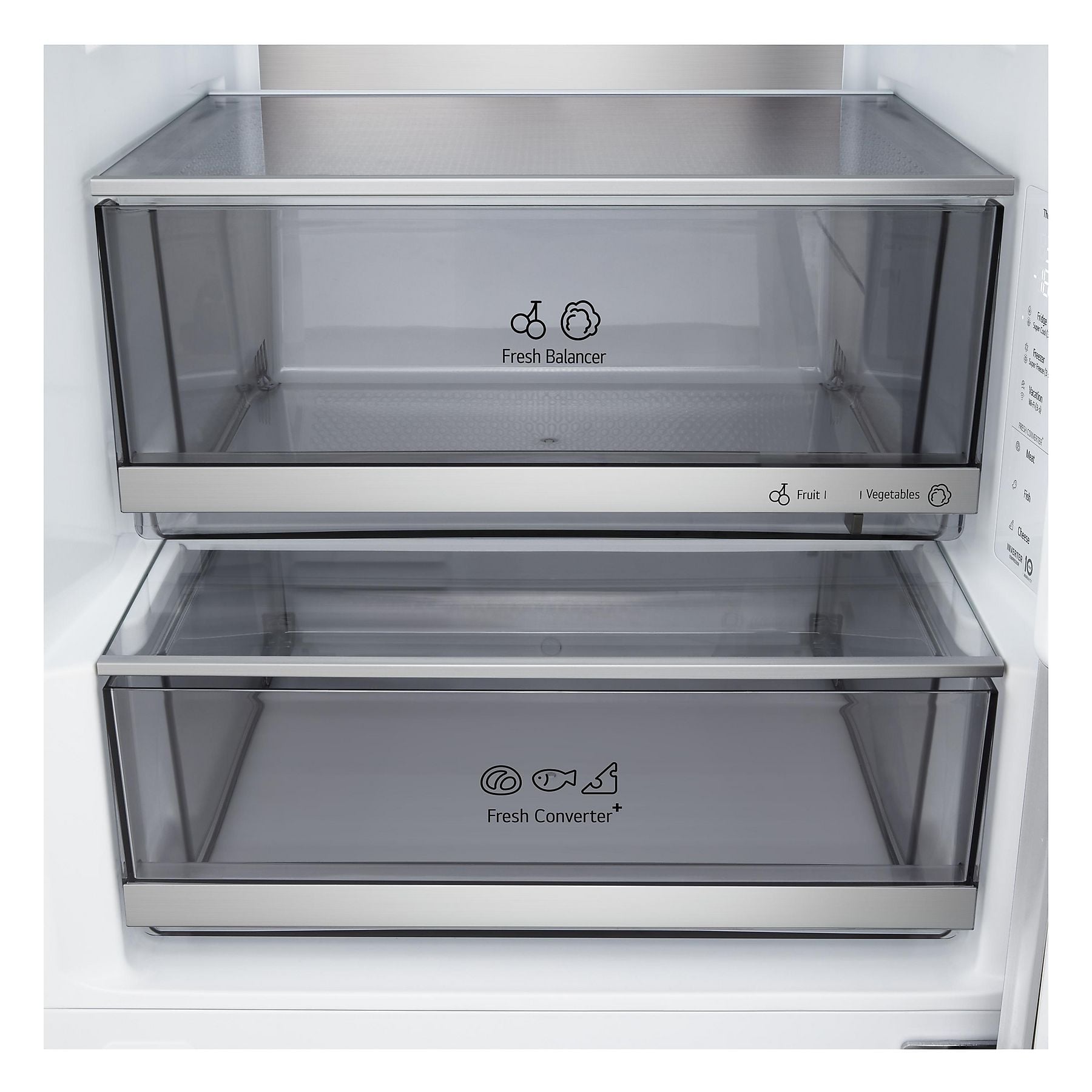 Die LG GBBS726BPY Kühlgefrierkombination überzeugt durch innovative Technologien, die deine Lebensmittel länger frisch halten. Der Smart Inverter Compressor® sorgt für einen leisen und energieeffizienten Betrieb – ohne Kompromisse bei der Zuverlässigkeit. Besonders praktisch ist die Total No Frost Technologie, denn sie erspart dir das lästige Abtauen. Dank LinearCooling® und DoorCooling+® wird eine gleichmäßige Kühlung gewährleistet, was die Temperaturschwankungen im Kühlschrank minimiert. Der FRESHConverter+® geht noch einen Schritt weiter: Mit flexiblen Temperatureinstellungen lassen sich unterschiedliche Lebensmittelgruppen ideal lagern – ob Fleisch, Fisch oder Käse.