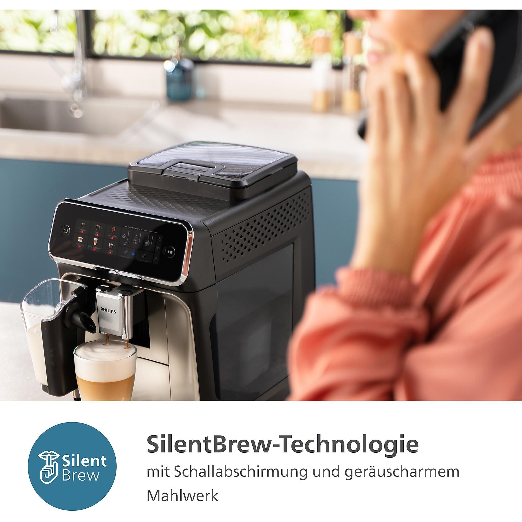 3 Kaffeespezialitäten, intuitives Display, leise Kaffeezubereitung, Scheibenmahlwerk aus 100 % Keramik, Aromaverschluss, herausnehmbare Brühgruppe, geführte Entkalkung, AquaClean, das LatteGo Milchsystem bereitet automatisch samtig-cremigen Milchschaum für Cappuccino zu |