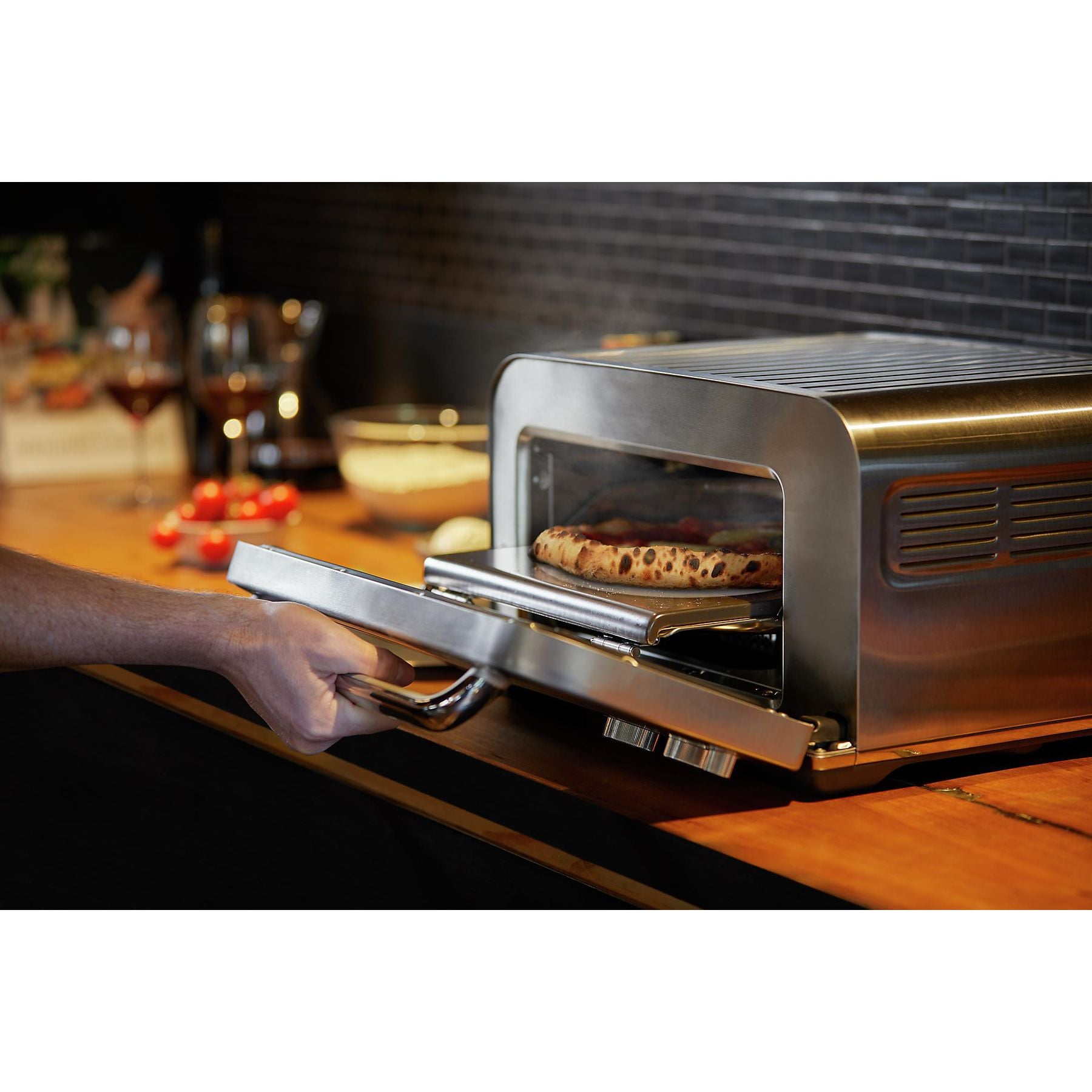 The Smart Oven Pizzaiolo ist ein Kompaktofen für den Haushalt, der eine Temperatur von bis zu 400 °C erreicht und eine authentische holzbefeuerte Steinofenpizza* in nur 2 Minuten replizieren kann. Er bietet alle drei Heizarten eines herkömmlichen Backofens: Direkte Hitze, Strahlungs- und Konvektionshitze. Das Element iQ-System bietet die ideale Backumgebung für Pizzen verschiedenster Arten, z. B. Pizza mit dicker Kruste, Pfannenpizza, dünne und knusprige Pizza sowie Tiefkühlpizza.