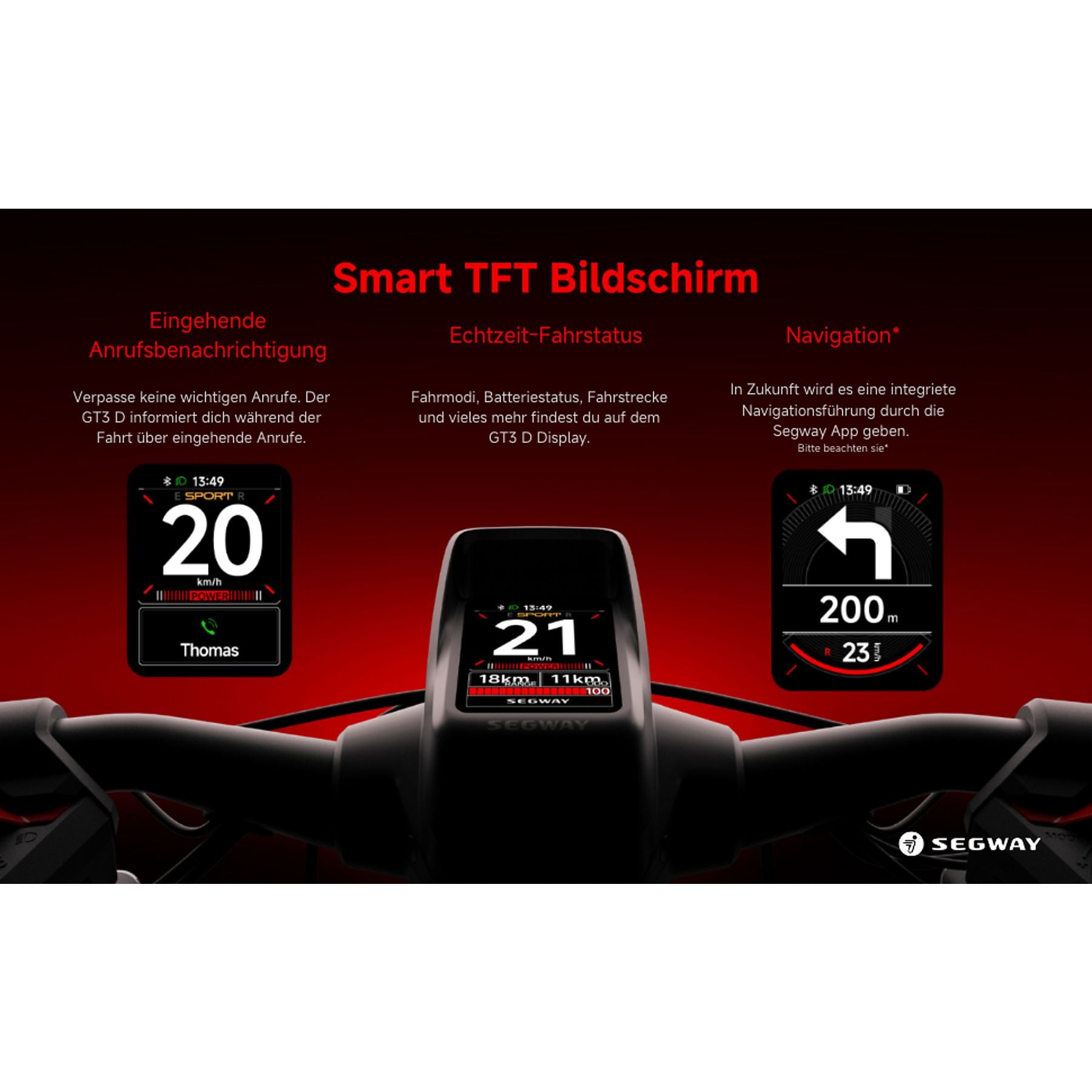 Smart TFT (Geschwindigkeit, verbleibende Energie, Modi, Wartung, Bluetooth-Verbindung und links/rechts Blinkeranzeige) |