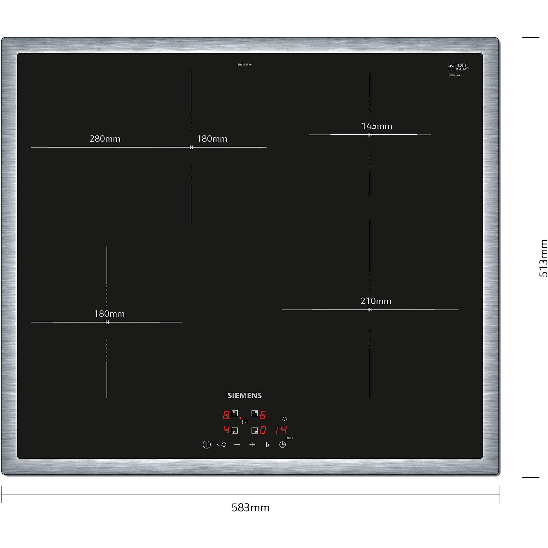 Der Backofen im SIEMENS PQ613PIAA Backofenset hat die Maße 594 mm (Breite) x 595 mm (Höhe) x 548 mm (Tiefe). Das Kochfeld misst 583 mm in der Breite und 513 mm in der Tiefe. Die Mindestnischenmaße für den Einbau betragen: Höhe ca. 585–595 mm, Breite ca. 560–568 mm, Tiefe ca. 550 mm, was das Gerät passend für einen klassischen 60er-Einbauschrank macht.